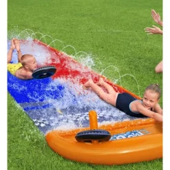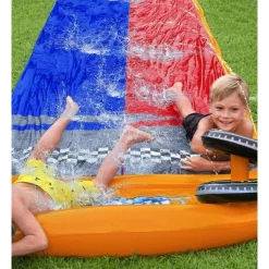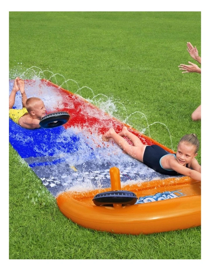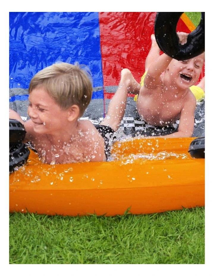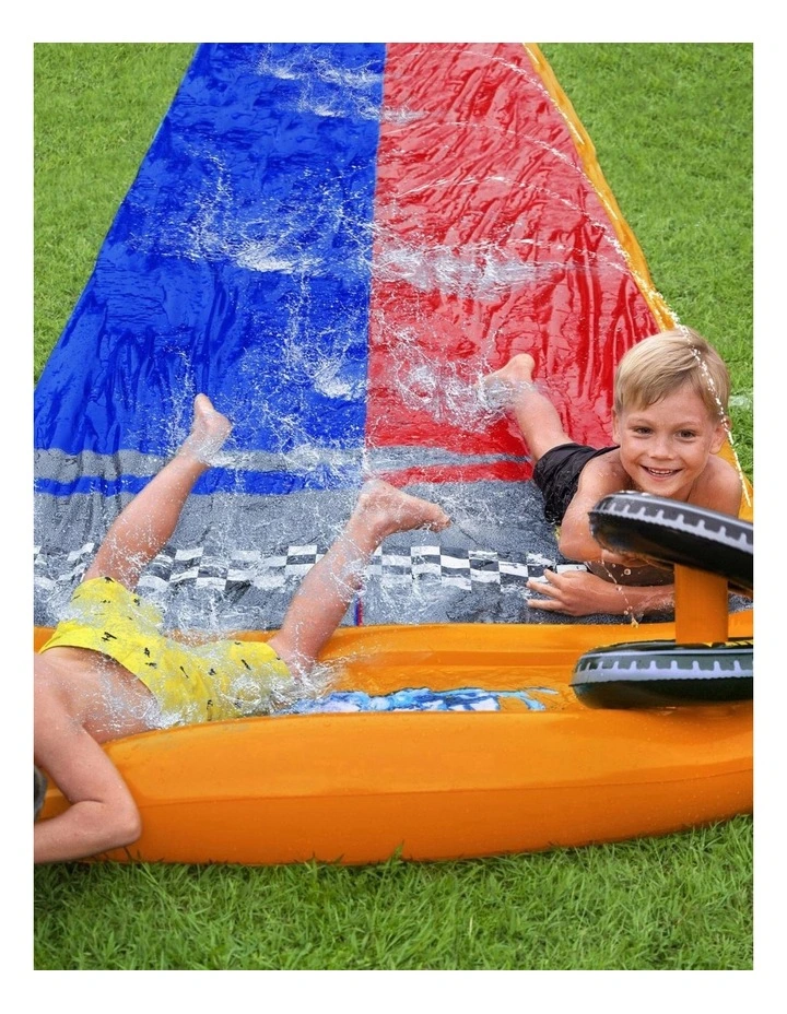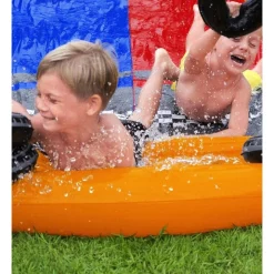 The H2OGO! Splashy Speedway Slide is the perfect way to get your kids off the couch and out into the sun! This slide measures 4.88 m long, giving kids lots of room to splash and slide. Plus, with multiple lanes, it was built for racing and playing together. Two kids can slide at a time, making this a fun competition that will keep them active and entertain them for hours.