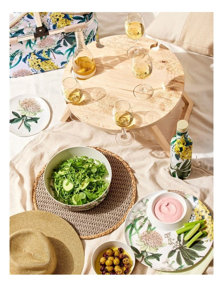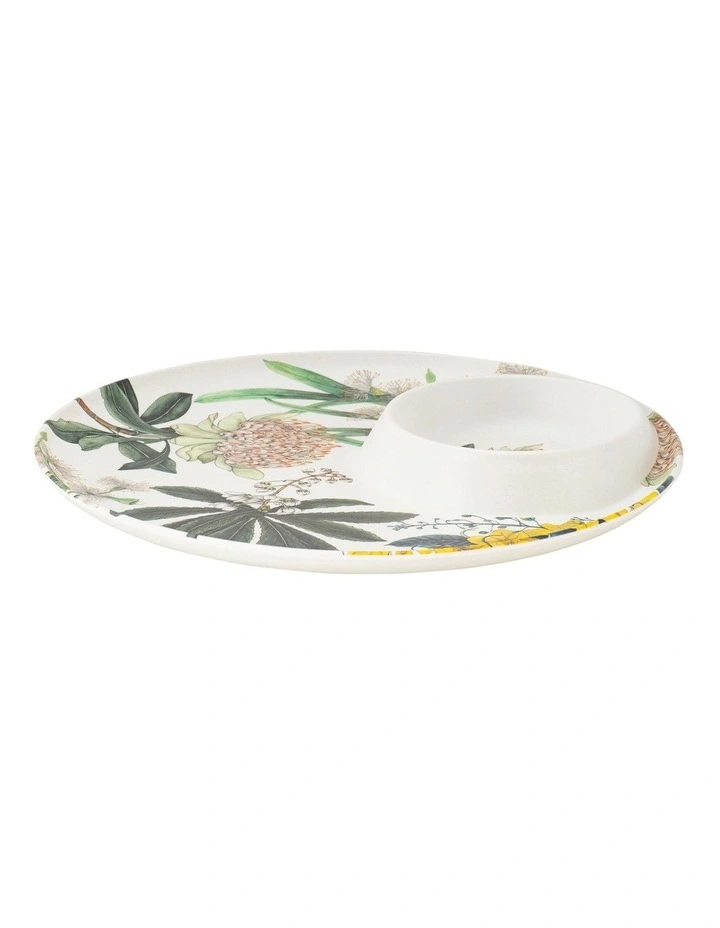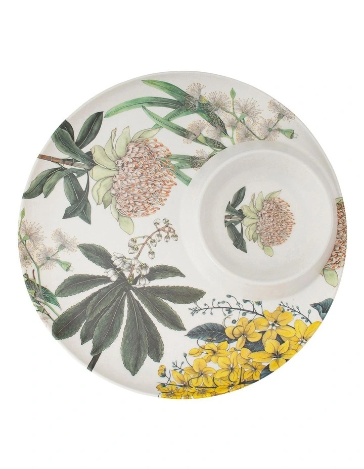 Get set for summer with this bamboo chip & dip from the Golden Summer collection. Created in collaboration with Sydney artist ‘the Blck Pen’, it features a contemporary floral design. This beautiful chip & dip is a beautiful way to serve crackers, chips and finger food, with a generous platter and raised dip section. Made from lightweight, durable bamboo fibre, it’s perfect for picnics and outdoor entertaining.
