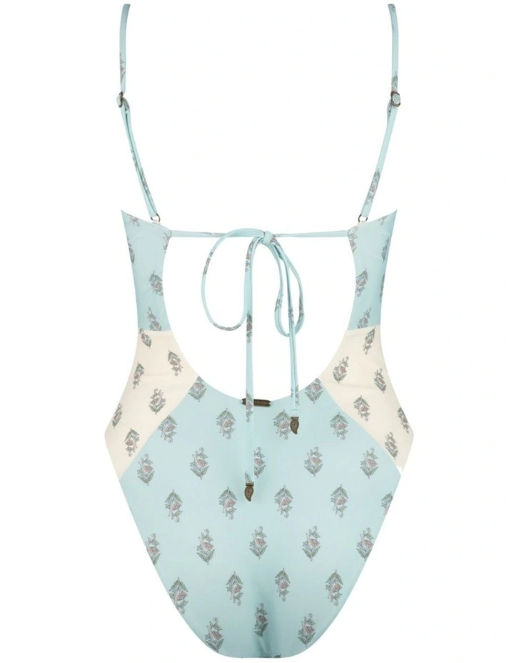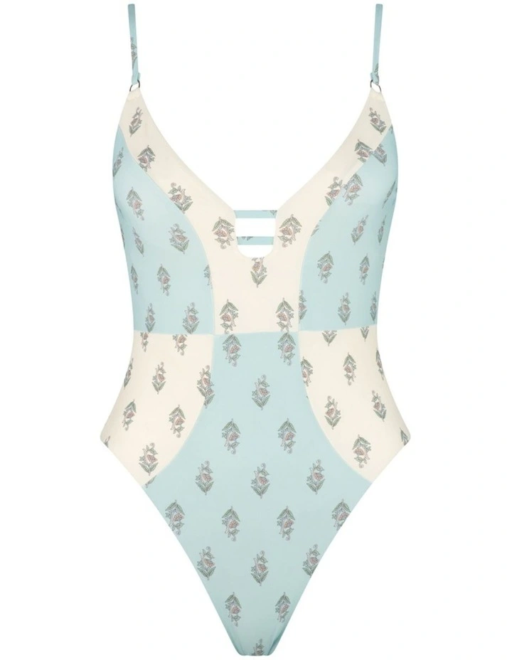 New Tigerlily one piecestyle, in our iconic patchwork design. Adjustable thin shoulder strap detail.This one piece has a high cut leg line, and medium coverage.